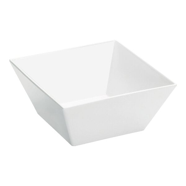 Give your food presentation a new, stylish look with this Cal-Mil SR262 square melamine bowl! It features a contemporary tapered profile with level sides and crisp corners. Ideal for displaying salads, fruit, side dishes, pastas, and more, this bowl can be used for both hot and cold foods. Whether served on its own or part of a decorative display riser (sold separately), it makes a perfect addition to your buffet, table service, or special event. Featuring the upscale look of white porcelain without the risk of breakage, this bowl is made of melamine for increased durability. Mix and match it with other white melamine bowls and platters to add a stylish look to any setting!