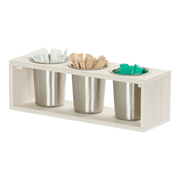 This Cal-Mil Vista 3-cylinder flatware / condiment display is great for keeping forks, spoons, and knives separate and within easy reach. Its horizontal layout provides a low-profile look that fits perfectly on crowded countertops while ensuring high-traffic service areas remain tidy. The unit holds 3 cylinders (sold separately) that are perfect for holding your tableware.