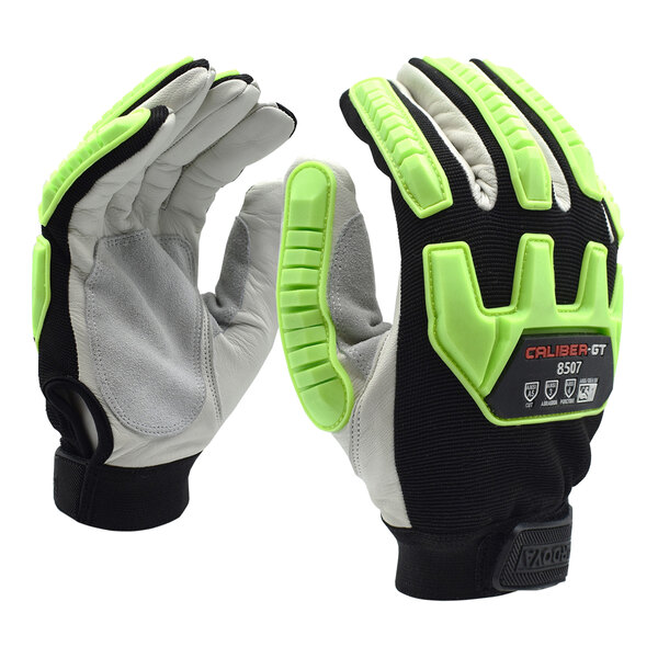 Protect your hands with this Cordova CALIBER-GT pair of gloves. This pair of gloves boasts ANSI level A5 cut protection, meaning that more than 2,200 grams of weight is required to cut through the material. This ensures worry-free tasks for your employees as they can be sure the gloves will remain durable, comfortable, and fully capable of guarding against accidental scrapes, even in high volume, fast-paced settings. Plus, hi-vis lime thermo-plastic rubber (TPR) protectors on the back of the fingers, hands, and knuckles provide impact protection and cushioning during tough jobs. TPR has the added advantages of not cracking, providing superior flexibility, and it lasts longer than solid plastic. Perfect for warehouses, construction sites, and handy-man jobs alike, this pair of gloves is sure to boost both safety and productivity.