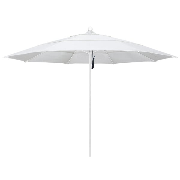 Keep your decks, outdoor dining areas, or pool-side patios shaded with this California Umbrella ALTO 118 PACIFICA Venture 11' round pulley lift umbrella with 1 1/2" matte white aluminum pole. An essential addition to commercial environments, the Venture series offers umbrellas that are created with superior materials and exude a classic, sophisticated appearance. This umbrella features a 1 1/2" thick, double wall matte white aluminum pole with sleek, stainless steel hardware for a robust foundation. Its 1/2" thick, high-density fiberglass ribs bend with the wind without snapping or breaking, yet provide excellent support for the canopy. In addition, the double wind vent allows for sufficient air flow to ensure stability and prevent the umbrella from moving with strong wind gusts. The Pacifica fabric is water-resistant but not water-proof and is not intended for use in wet conditions. During inclement weather, please store umbrellas in a dry location or cover with a protective umbrella cover sold separately.