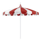 Keep your decks, outdoor dining areas, or poolside patios shaded with this California Umbrella Pagoda 8 1/2' round push lift umbrella with 1 1/2" silver aluminum pole. With a fun, distinct appearance, the Pagoda line will set your intimate outdoor eatery apart from the rest. This umbrella features a silver 2-piece, 1 1/2" thick anodized aluminum pole for a robust foundation. Additionally, the fiberglass ribs provide excellent support for the canopy, and help form the bold curves that create its distinguishing form.