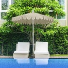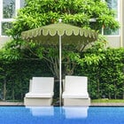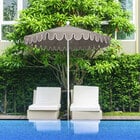 Keep your decks, outdoor dining areas, or poolside patios shaded with this California Umbrella Salinas 7 1/2' round manual lift umbrella with 1 1/2" white aluminum pole. With a scalloped edge and bright white trim, this umbrella is sure to add a trendy touch to any setting. It features a 2-piece, 1 1/2" thick white aluminum pole for a robust foundation. Additionally, the fiberglass ribs provide excellent support for the canopy, and help form the bold curves that create its distinguishing form.