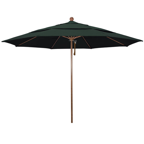Keep your decks, outdoor dining areas, or poolside patios shaded with this California Umbrella Venture Series 11' forest green pulley lift umbrella with 1 1/2" American oak aluminum pole. This umbrella features a 1 1/2" thick aluminum pole with an American oak finish, giving it a classic wooden look without requiring the upkeep. The aluminum pole uses sleek, stainless steel hardware for a robust foundation, and the umbrella's high-density fiberglass ribs bend with the wind without snapping or breaking, providing excellent support to the canopy. Plus, the umbrella's 11' size has sufficient area coverage, providing multiple guests with relief from the sun's gusts. The Pacifica fabric is water-resistant but not water-proof and is not intended for use in wet conditions. During inclement weather, please store umbrellas in a dry location or cover with a protective umbrella cover sold separately.