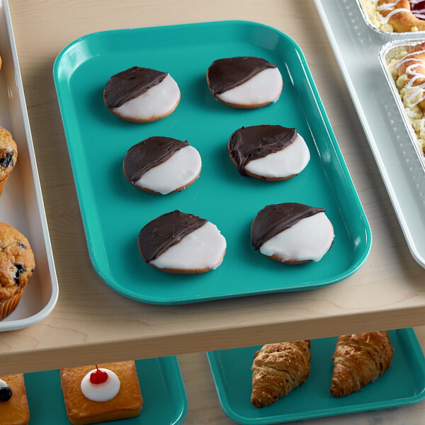This Cambro 1015MT140 10" x 15" green fiberglass tray is the perfect way to display your delicious desserts. The tray is made of durable, reinforced high-impact fiberglass, making it stain and odor resistant. It does not oxidize like traditional aluminum trays, and it also dries faster due to its Dri-Stak stacking lug separators. At 15" long, this tray is optimal for displaying pastries side by side, and its green color provides a unique and attractive look.