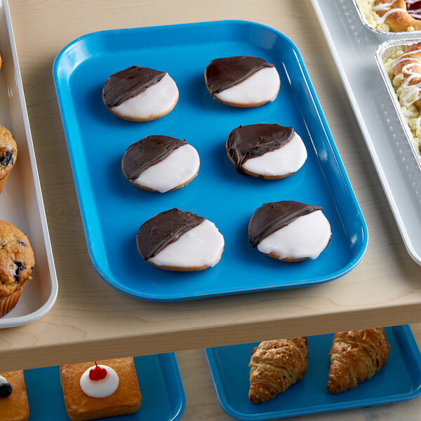 This Cambro 1015MT142 10" x 15" blue fiberglass tray is the perfect way to display your delicious desserts. The tray is made of durable, reinforced high-impact fiberglass, making it stain and odor resistant. It does not oxidize like traditional aluminum trays, and it also dries faster due to its Dri-Stak stacking lug separators. At 15" long, this tray is optimal for displaying pastries side by side, and its blue color provides an elegant look.