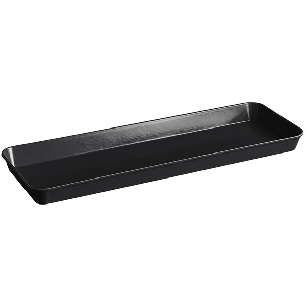 This Cambro 10302MT110 10" x 30" black fiberglass market pan is the perfect way to display your delicious appetizers, deli meats, or prepared salads. The pan is made of durable, reinforced high-impact fiberglass, making it stain and odor resistant. It does not oxidize like traditional aluminum pans, and it also dries faster due to its Dri-Stak stacking lug separators. At 30" long, this pan is optimal for displaying your offerings side by side, and its black color provides a sleek and attractive look.