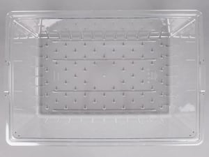 This 26" x 18" food box colander features holes along the bottom to allow liquids and juices to drain through to the bottom of the food storage box. It helps enhance food quality and reduces the risks of cross contamination.