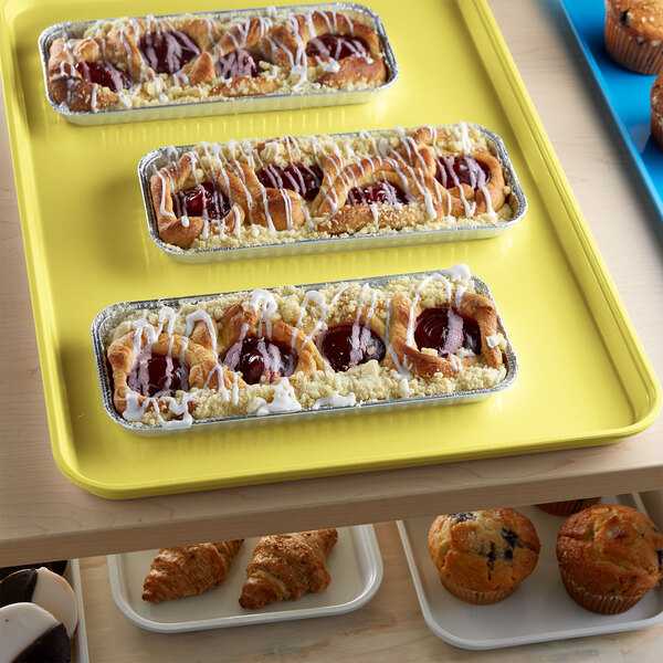 This fiberglass tray is the perfect way to display desserts at your bakery, supermarket, or diner. Great for arranging pastries side by side, this tray's yellow color provides a sleek and professional look. The warm yellow background helps showcase your signature baked goods to easily catch customer's attention.