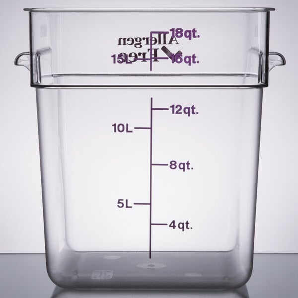 This 18 qt. storage container makes it easy to identify allergen-free ingredients in dry storage spaces and coolers. It features purple graduations and is labeled allergen-free in bold purple letters. By using this color-coded food storage container, you'll be able to keep ingredients separate during preparation and reduce exposure to allergens!
