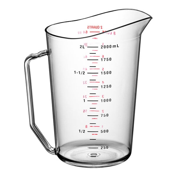 Quickly and easily measure out water, milk, or juice with this 2 qt. clear measuring cup! Add liquid ingredients to any of your signature recipes with comfort and accuracy. This is a must-have item in any bakery, restaurant, or catering kitchen. Plus, the ergonomic design and durable construction make it easy-to-use and long lasting.
