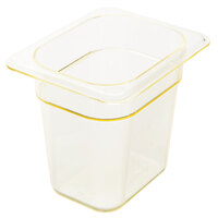 This amber Cambro 24HP150 H-Pan™ 4" deep, 1/2 size high heat plastic food pan is perfect for holding high heat and freezing foods in any commercial kitchen. It's built with strong, durable materials to withstand extreme temperatures from -40 to 375 degrees Fahrenheit and will help maintain your food's temperature after it's taken out of the oven or freezer. This high heat food pan's convenient, non-stick smooth interior surface increases yields and promotes easy cleaning. To aid in storage, transport, and create more usable space, this pan will even stack with similar items without wedging or sticking.