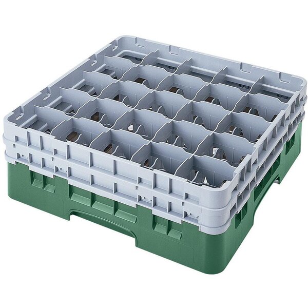 This Cambro 25S638119 Sherwood Green customizable 25 compartment full size Camrack is perfect for washing, storing, and transporting large diameter beverage glasses, red wine stems, goblets, most rocks glasses, and other items with a diameter of up to 3 7/16", standing up to 6 7/8" in height. Included is (1) gray 25E1 extender, (2) gray 25E2 extenders and (1) sherwood green BR258 base rack.