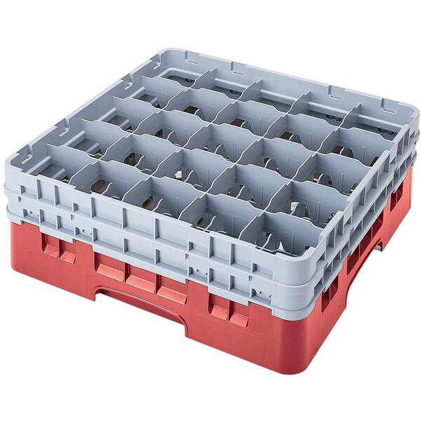 This Cambro 25S800163 red customizable 25 compartment full size Camrack is perfect for washing, storing, and transporting large diameter beverage glasses, red wine stems, goblets, most rocks glasses, and other items with a diameter of up to 3 7/16", standing up to 8 1/2" in height. Included is (1) gray 25E1 extender, (3) gray 25E2 extenders and (1) red BR258 base rack.