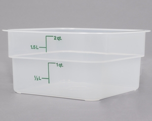 This container is perfect for portioning and storing your ingredients, toppings, and pre-prepared foods. The translucent design lets you quickly recognize contents and minimize unnecessary openings. Pair it with a compatible lid (sold separately) to keep your foods fresh. This versatile container has a 2 qt. capacity, so the possibilities are endless!