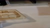 Cambro High Heat lid works great. It clips on the 1/6 bin easily and allows to place a scoop inside. It makes the line more efficiently.