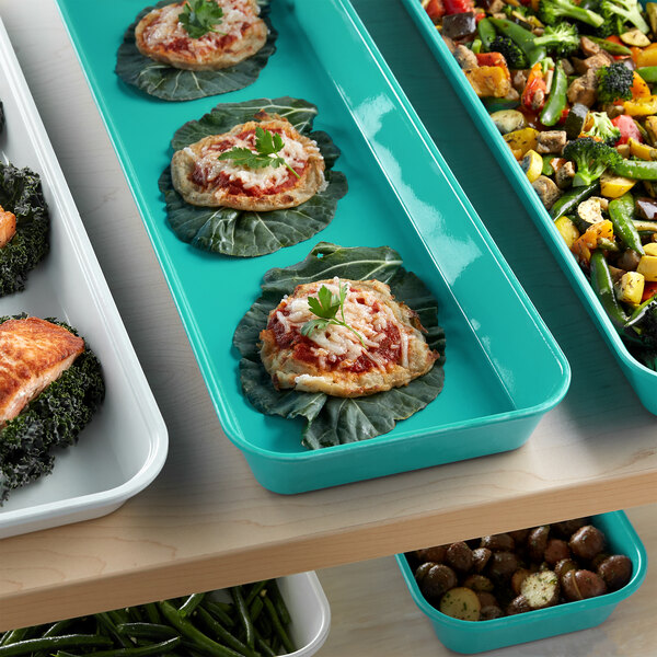 This fiberglass pan is the perfect way to display salads and desserts at your deli, supermarket, or diner. Great for arranging pastries side by side, this pan's green color provides a sleek and professional look. The cool green background helps showcase your signature baked goods to easily catch customer's attention.