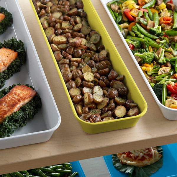 Attractively merchandise deli salads and desserts with this Cambro 6302MT145 7" x 30" yellow fiberglass market pan.