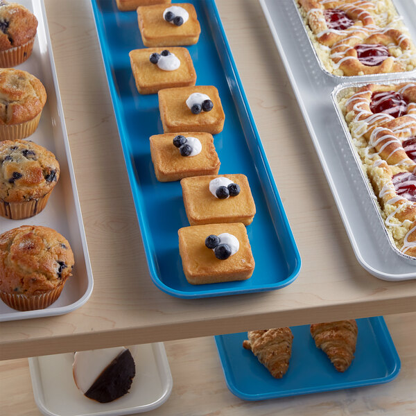 This fiberglass tray is the perfect way to display desserts at your bakery, supermarket, or diner. Great for arranging pastries side by side, this tray's bright blue background helps showcase your signature baked goods to easily catch customer's attention.