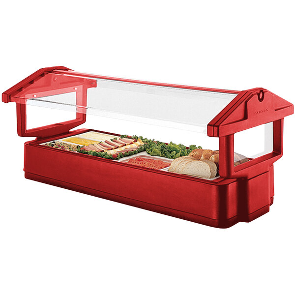 This Cambro red table top food bar has a scratch-resistant textured exterior surface that is simple to clean. For added convenience and safety, this unit includes a protective sneeze guard.