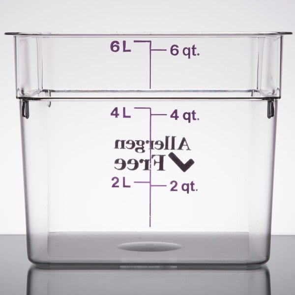 The Cambro 2SFSCW441 CamSquare 2 Qt. Allergen Free Purple Food Storage Container is excellent. The quality is exceptional and the price is very low. This is perfect for food storage as well as measurements. The color is a plus. Definitely recommend!