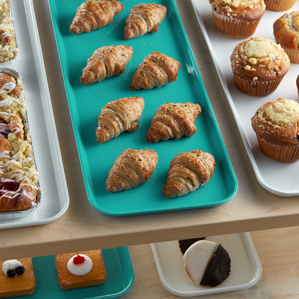 Attractively merchandise exquisite pastries, desserts, and baked goods with this Cambro 826MT140 8" x 26" green fiberglass market tray.