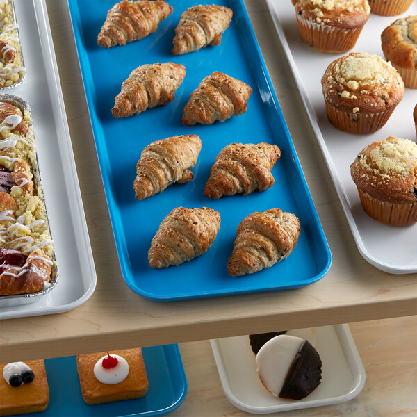 Attractively merchandise exquisite pastries, desserts, and baked goods with this Cambro 826MT142 8" x 26" blue fiberglass market tray.