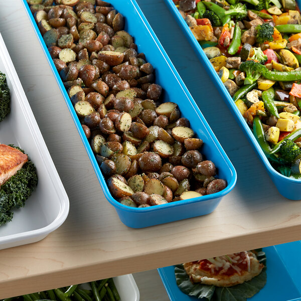 This fiberglass pan is the perfect way to display signature offerings at your supermarket or deli. Great for arranging entrees and a la carte options, this pan's blue color provides a sleek and professional look. The bold blue background also helps showcase your carefully prepared foods to easily catch customer's attention.