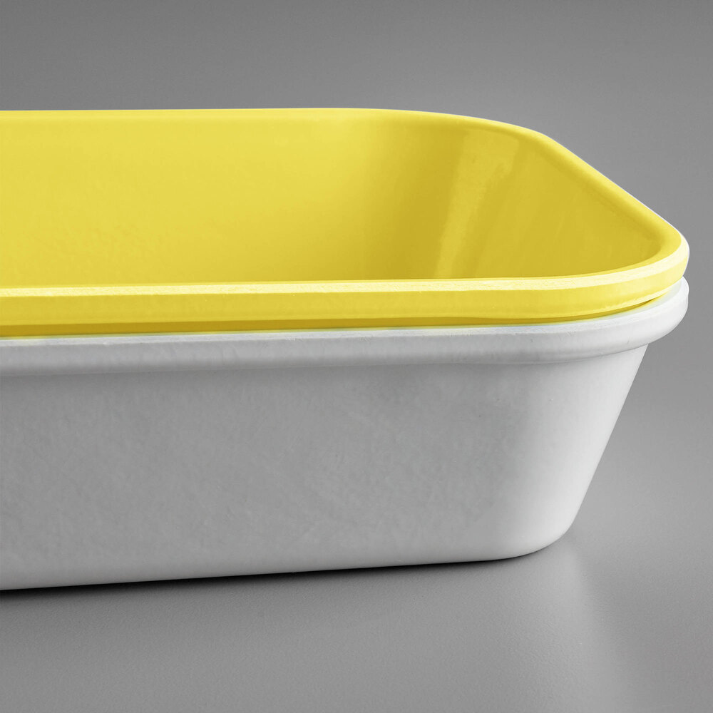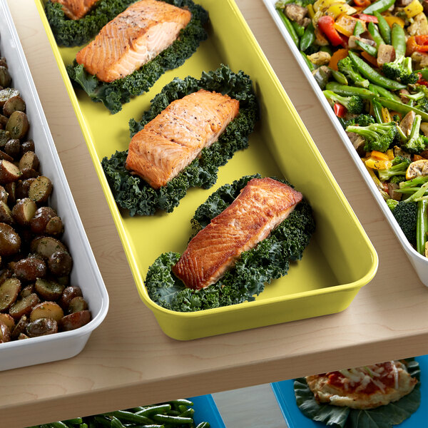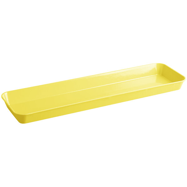 This fiberglass pan is the perfect way to display signature offerings at your supermarket or deli. Great for arranging sides and a la carte options, this pan's yellow color provides a sleek and professional look. The bold yellow background also helps showcase your carefully prepared foods to easily catch customer's attention.