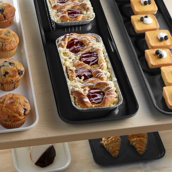 This fiberglass tray is the perfect way to display desserts at your bakery, supermarket, or diner. Great for arranging pastries side by side, this tray's black color provides a sleek and professional look. The bold black background helps showcase your signature baked goods to easily catch customer's attention.