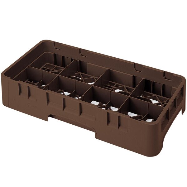 This Cambro 8HS434167 brown 8 compartment half size Camrack is perfect for washing, storing, and transporting large cocktail glasses, delicate wine stems with oversize bowls, and other items with a diameter of up to 4 1/16", standing up to 5 1/4" in height. Included is (1) gray 8HE1 extender, (1) gray 8HE2 extender and (1) brown HBR258 base rack.