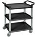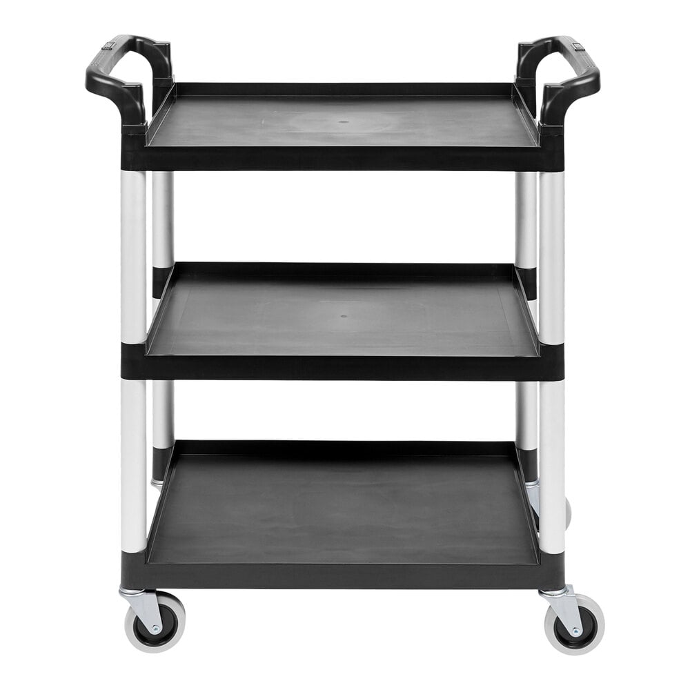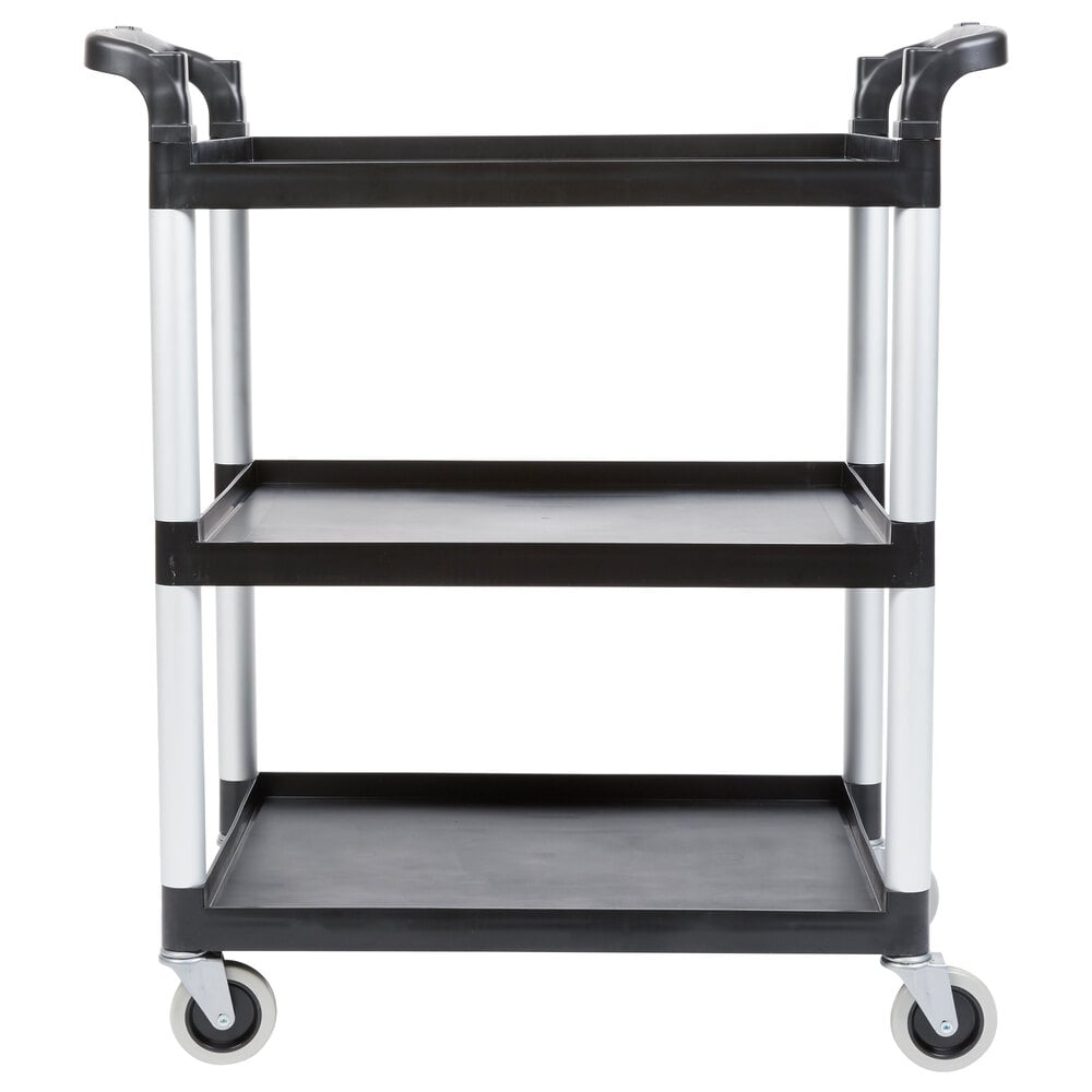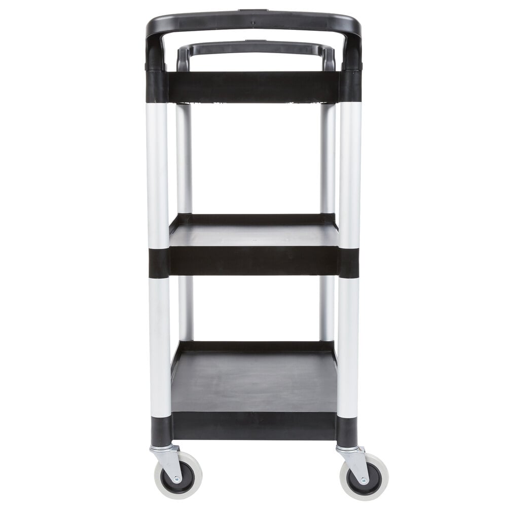 Perfect for hauling bus tubs, food pans, plates, flatware, dry ingredients, and more, this reliable black utility cart moves essential items from one room to the next with incredible ease. A durable construction, including aluminum uprights and sturdy shelves, ensures long-lasting use. With a smooth rolling design that anyone can use, this cart is ideal for any crowded restaurant, cafeteria, or catering event.