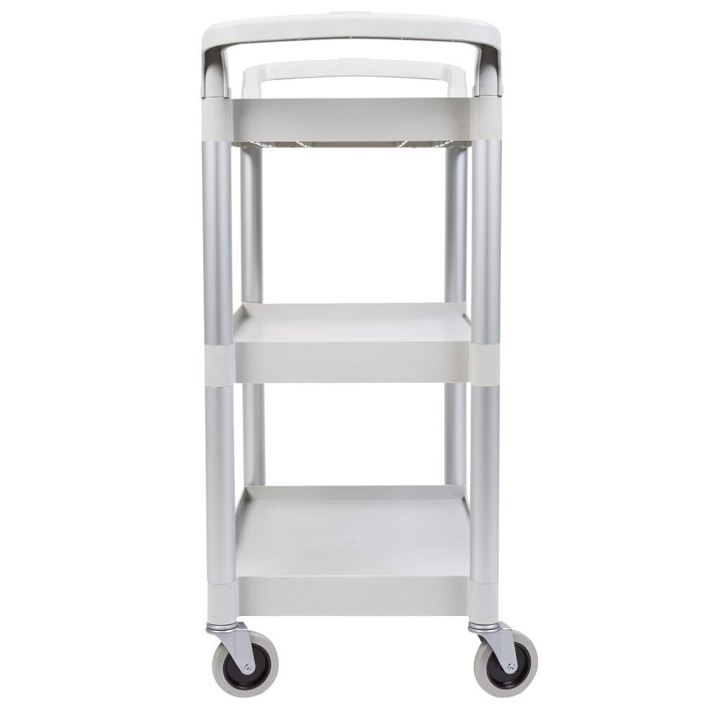 Perfect for hauling bus tubs, food pans, plates, flatware, dry ingredients, and more, this reliable white utility cart moves essential items from one room to the next with incredible ease. A durable construction including aluminum uprights and sturdy shelves ensures long-lasting use. With a smooth rolling design that anyone can use, this cart is ideal for any crowded restaurant, cafeteria, or catering event.