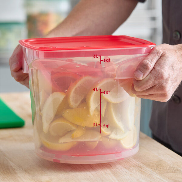 Ideal for high-volume foodservice establishments, this 6 qt. food container features standard and metric graduations in bold red with a matching drain tray and lid (both sold separately) for a full color-coded system. Plus, the drain holes on each handle provide a sanitary method for drying.