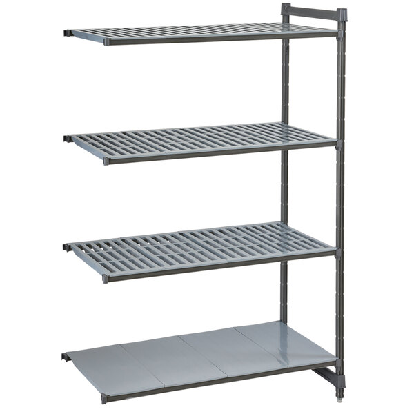 This Cambro CBA184284VS4580 Camshelving® Basics Plus add on unit with 3 vented shelves and 1 solid shelf allows you to easily boost the storage space of your preexisting Basics Plus series Camshelving® unit! Great for all of your light to medium-duty storage needs, this package includes 4 shelves, 2 posts with pre-installed post connectors and wedges, matching dovetails, and 8 traverses. The vented shelves facilitate optimal airflow and the solid shelf can hold smaller items while containing leaks and spills. The traverses on both the first and second unit share the middle post, eliminating the need for add-on clips or s-hooks. When built in a straight line, there is no loss of weight bearing capacity.