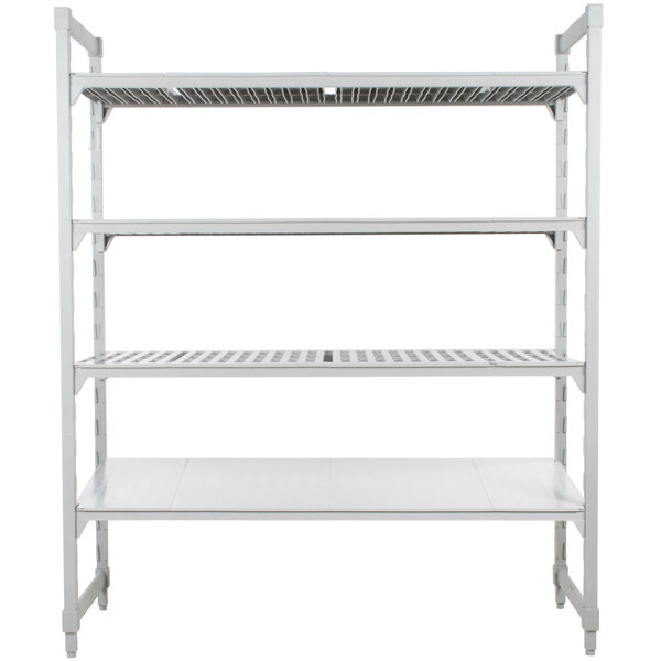 As part of the Premium series, this Cambro Camshelving® Premium CPU184864VS4480 stationary starter unit comes equipped with all of the features you expect in a Camshelving® product. This unit includes 3 vented shelves, 1 solid shelf, 4 steel core posts, and 8 matching traverses, all with a thick polypropylene outer layer for superior strength and durability.