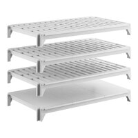 As part of the Premium series, this Cambro Camshelving® Premium CPU213684VS4PKG stationary starter unit comes equipped with all of the features you expect in a Camshelving® product. This unit includes 3 vented shelves, 1 solid shelf, 4 steel core posts, and 8 matching traverses, all with a thick polypropylene outer layer for superior strength and durability.