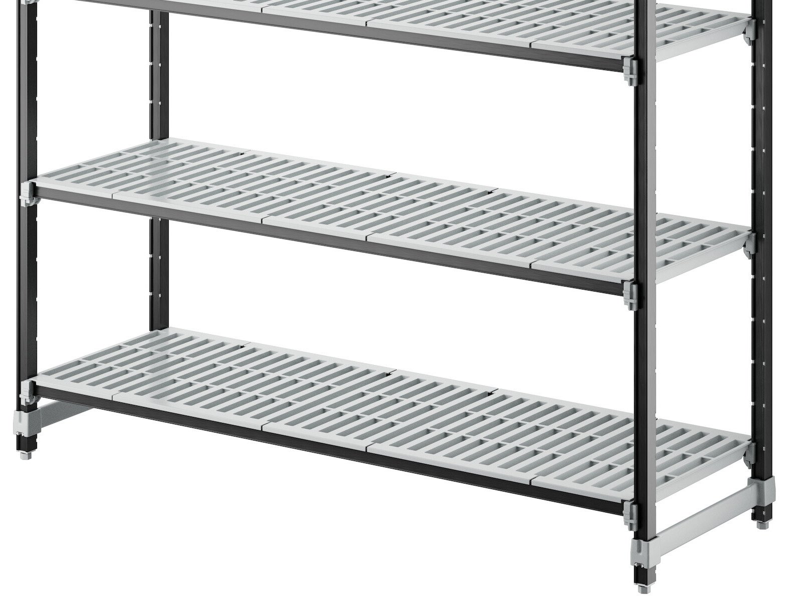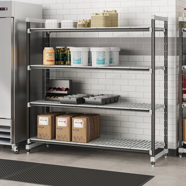 With vented shelves to provide optimum air flow and Camguard antimicrobial coating to keep stored items clean, this vented shelving system comes with all of the features you expect in a Camshelving® product. Equipped with 4 posts, pre-installed post connectors and wedges, 16 dovetails, 4 shelves, and 8 universal traverses, you'll have everything you need to start building this versatile and efficient shelving system right out of the box. Plus, this kit boasts a 50% decrease in the number of pieces compared to its former Elements standard kit counterpart, and no weight capacity is lost with kits that are attached to add-on kits.