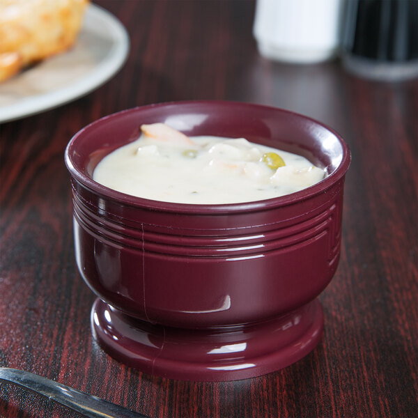 The Cambro MDSB5487 Shoreline 5 oz. cranberry bowl is the ideal size for serving a small side of soup, applesauce, or yogurt in your health care, long-term care, or correctional facility. Made with durable polypropylene material, it resists chipping, denting, and breaking. Plus, it is easy to wash after use and is even safe to use with high temperature dishwashers. Coming in a stylish cranberry color, this bowl allows you to create an organized, color-coded system in your kitchen.