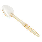 Ideal for preparing and serving hot and cold foods, this Cambro SPO13150 amber high heat solid spoon is great for everyday use at your fast-paced deli, grocery store, or any hot buffet line. Its durable high heat construction ensures that it can withstand temperatures from -40 to 375 degrees Fahrenheit. A notched back is designed to rest on pans between use, while a hanging hole on the handle makes for easy accessibility during storage.