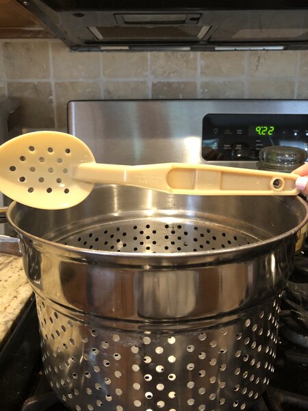 Love this plastic bridge colored perforated spoon. Works so perfectly for me to cook rice on the stove top and to serve it to my quests when I’m finished cooking.