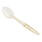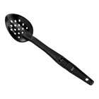 Ideal for preparing and serving hot and cold foods, this Cambro SPOP13110 black high heat perforated deli spoon is great for everyday use at your fast-paced deli or grocery store. Its durable high heat construction ensures that it can withstand temperatures from -40 to 375 degrees Fahrenheit. A notched back is designed to rest on pans between use, while a hanging hole on the handle makes for easy accessibility during storage.