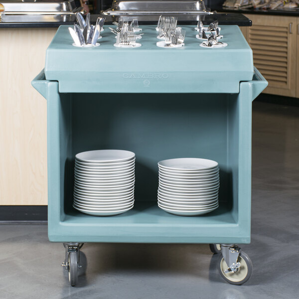 Keep your trays, plates, and accessories in one convenient location from kitchen to serving line with this Cambro TDC2029401 slate blue tray/dish cart.