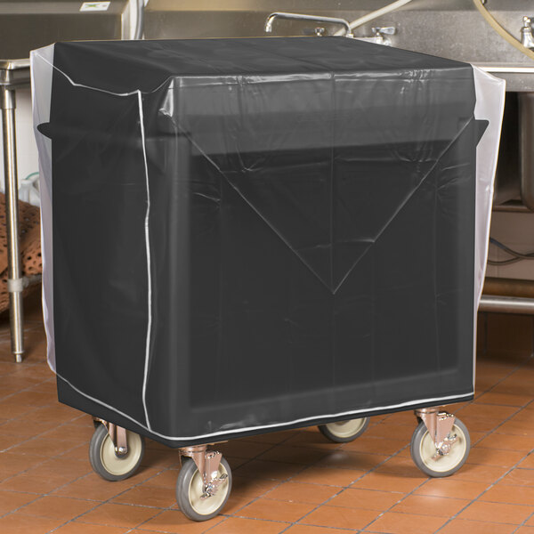 Keep your trays, plates, and accessories in one convenient location from kitchen to serving line with this Cambro TDCR12110 black tray/pan cart with pans and vinyl cover.