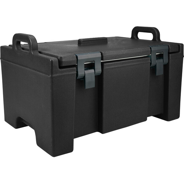 Keep hot or cold food at the optimum serving temperature for up to 4 hours with the Cambro UPC100110 Camcarrier® black top loading 8" deep insulated food pan carrier! This top loading food pan carrier holds up to three, 2 1/2" deep full size food pans for easy transport to your next catered event. This pan carrier's self-venting design, polyurethane insulation, and airtight gasket combine to ensure excellent food quality and temperature retention.