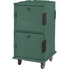 Keep hot food hot or cold food cold for 4 hours or more with this slate blue Cambro UPC1600HD131 Ultra Camcart® slate blue insulated food pan carrier with heavy-duty casters! This double-compartment, high-capacity cart's molded polyethylene shell coupled with thick foam insulation throughout the unit ensure its ability to maintain safe food temperatures. This model can transport up to 24 2 1/2" deep full size food pans, 16 4" deep pans, 12 6" deep pans, 8 8" deep pans, or up to 48 3253 size Camtrays! It also boasts a marine railing for added staging area!