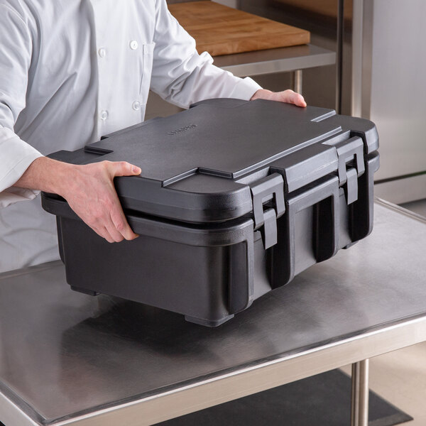 Keep hot food hot or cold food cold for up to 4 hours with the Cambro UPC160110 Camcarrier® Ultra Pan Carrier® black top loading 6" deep insulated food pan carrier! This top loading food pan carrier holds one, 6" deep full size food pan for easy transport to your next catered event. Its self-venting design, polyethylene insulation, and airtight gasket combine to ensure excellent food quality and temperature retention. Four durable nylon latches close securely and enable easy transport.