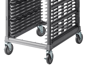 Made from a strong, virtually unbreakable, composite plastic, this pan rack is an excellent alternative to your typical metal bun racks. This plastic material will 100% not rust or corrode over time so you can count on your investment to last in your business.