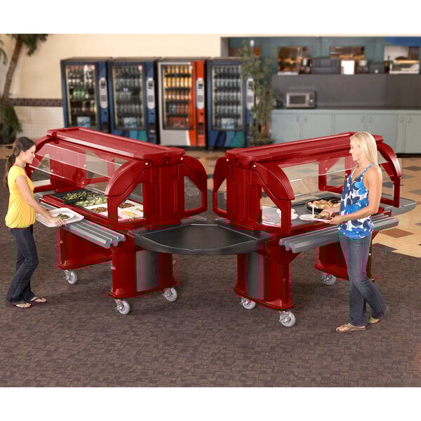 For easy and convenient self-service in your school or venue, this red Versa food bar is an ideal choice. Featuring a durable, all-weather design, the bar is lowered from the standard height to 55 3/4" high, providing easy access for all of your patrons or students. Plus, it accommodates up to 5 full size food pans, making it great for limited menus, side dishes, or for pairing with a second food bar (sold separately) for greater variety. After the meal, the bar easily folds down and fits through standard doorways, rolling on 6" casters and easily maneuvered with its molded-in handles.