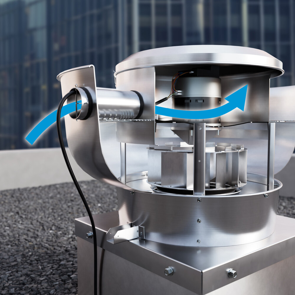 Essential to grease-laden air removal, this unit comes with an integrated grease drain that works to direct grease away from the fan base.