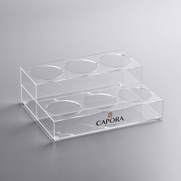 This Capora 2 tier syrup bottle organizer is a necessary addition to any bar, lounge, coffee shop, or cafe! This trendy storage solution features six 3 1/2" wide compartments to neatly organize and display a variety of flavoring syrups or alcohol bottles.